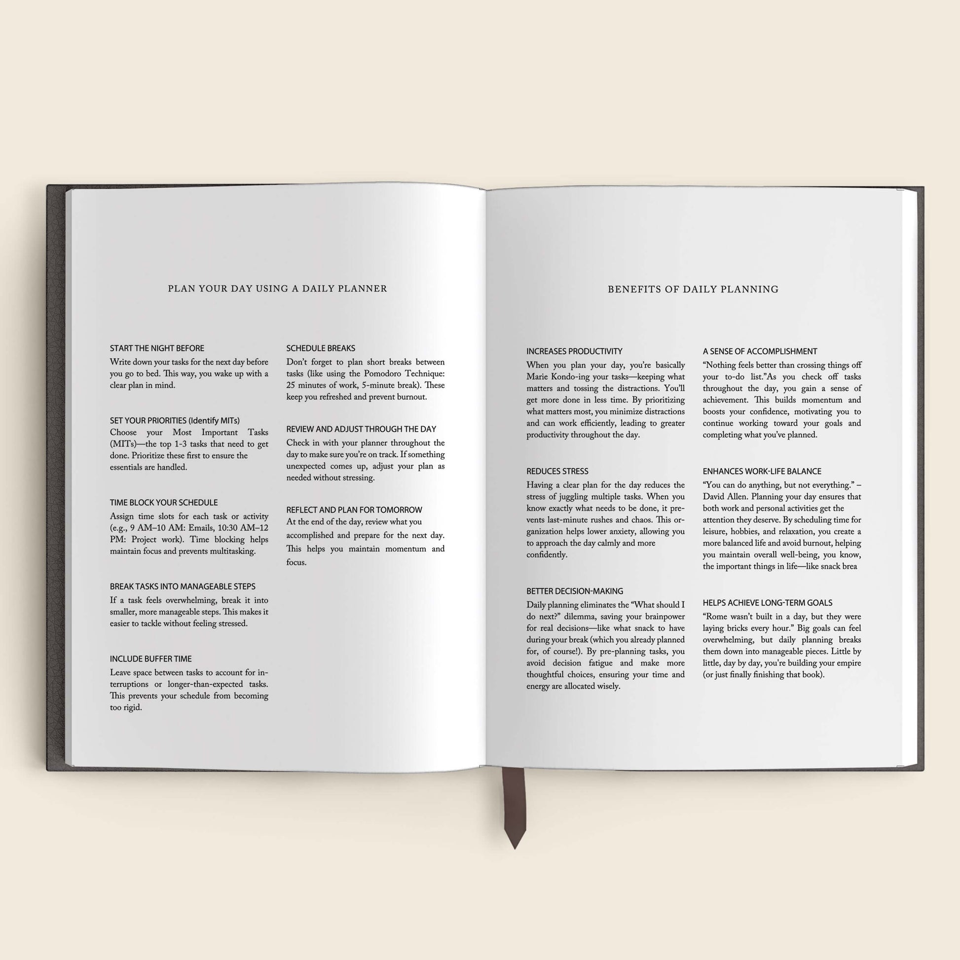 - Daily Spreads: Take it day by day with ample space for to-dos, notes, and reflections.